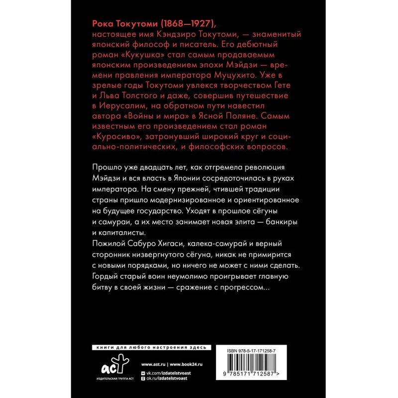 — Классика японской прозы. — От автора бестселлера «Кукушка» — самой продаваемой книги в период Мэйдзи. — Токутоми Рока — один из самых выдающихся японских новеллистов первой половины XX века. — Пронзительная история о крахе старых времен и неумолимом продвижении прогресса. — В переводе с японского Ирины Львовой.
