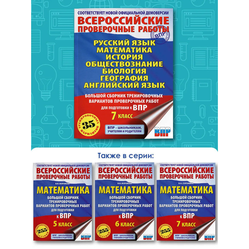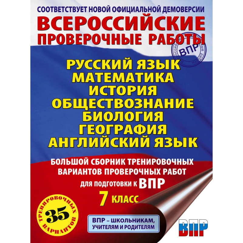 Данное пособие предназначено для учащихся 7-х классов общеобразовательных организаций. Оно позволяет в кратчайшие сроки проверить свои знания, потренироваться в выполнении заданий и тем самым успешно подготовиться к выполнению Всероссийских проверочных работы по итогам обучения в течение года. Пособие содержит 35 тренировочных вариантов проверочных работ по РУССКОМУ ЯЗЫКУ, МАТЕМАТИКЕ, ИСТОРИИ, ОБЩЕСТВОЗНАНИЮ, БИОЛОГИИ, ГЕОГРАФИИ И АНГЛИЙСКОМУ ЯЗЫКУ предметам, по которым пишут ВПР в 7 классе на всей территории страны. Содержание проверочных работ соответствует Федеральному государственному образовательному стандарту основного общего образования. Каждый вариант составлен в полном соответствии с демонстрационными вариантами, представленными на информационном портале по Всероссийским проверочным работам. В конце книги даны ответы на все задания, решения и критерии оценивания.