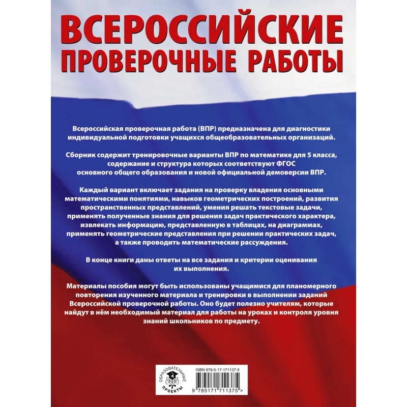 Данное пособие предназначено для учащихся 5-х классов общеобразовательных организаций. Оно позволяет в кратчайшие сроки проверить свои знания, потренироваться в выполнении заданий и тем самым успешно подготовиться к выполнению Всероссийской проверочной работы по математике по итогам обучения в 5-м классе. Пособие содержит 15 тренировочных вариантов проверочных работ. Содержание проверочной работы соответствует Федеральному государственному образовательному стандарту основного общего образования. Каждый вариант составлен в полном соответствии с демонстрационным вариантом, представленном на информационном портале по Всероссийским проверочным работам. В конце книги даны ответы на все задания, решения и критерии оценивания. Материалы пособия будут полезны учителям, которые найдут в нём материал для работы на уроках и контроля уровня знаний школьников по предмету.