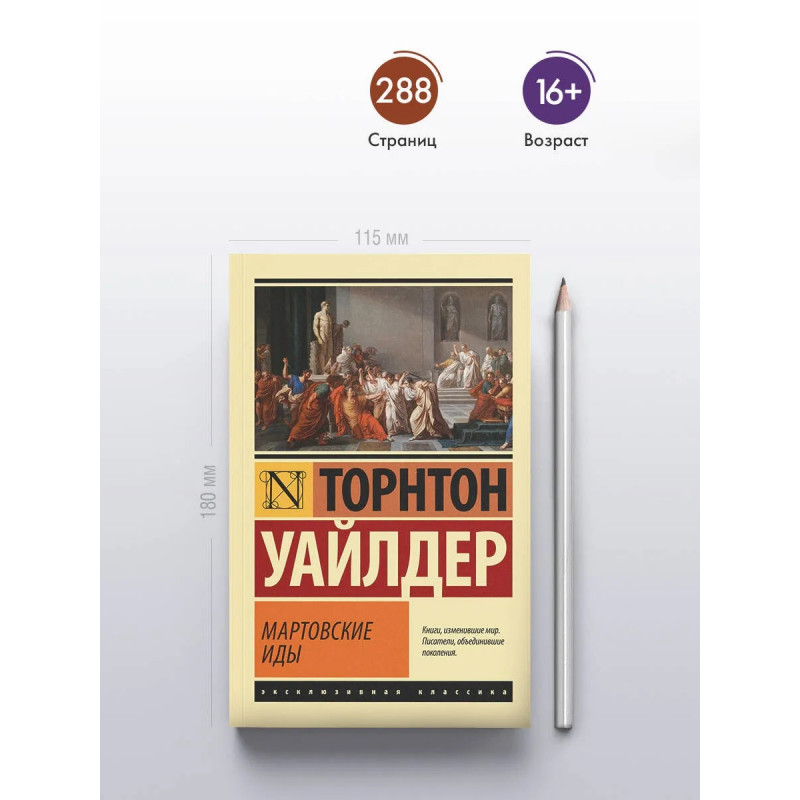 — Торнтон Уайлдер — один из самых выдающихся американских прозаиков первой половины XX века, трехкратный лауреат Пулитцеровской премии, лауреат Национальной книжной премии и многократный номинант на Нобелевскую премию по литературе. — Тортон Уайлдер — автор знаменитых романов «Каббала» и «Мост Людовика Святого». — «Мартовские иды» считаются одним из лучших произведений автора. — Знаменитый роман — теперь в удобном карманном формате и узнаваемом оформлении серии «Эксклюзивная классика».