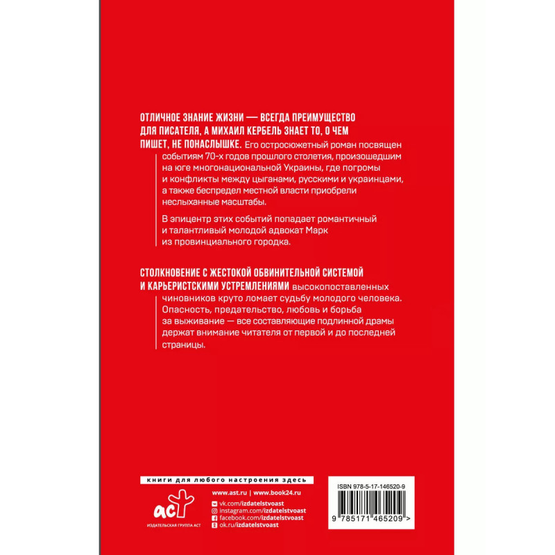 Отличное знание жизни всегда преимущество для писателя, а Михаил Кербель знает то, о чем пишет, не понаслышке. Его остросюжетный роман посвящен событиям 70-х годов прошлого столетия, произошедшим на юге многонациональной Украины, где погромы и конфликты между цыганами, русскими и украинцами, а также беспредел местной власти приобрели неслыханные масштабы. В эпицентр этих событий попадает романтичный и талантливый молодой адвокат Марк из провинциального городка. Столкновение с жестокой обвинительной системой и карьеристскими устремлениями высокопоставленных чиновников круто ломает судьбу молодого человека. Опасность, предательство, любовь и борьба за выживание все составляющие подлинной драмы держат внимание читателя от первой и до последней страницы.
