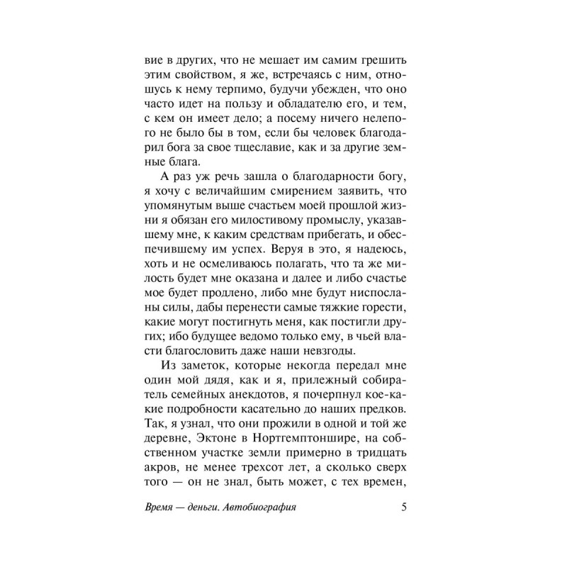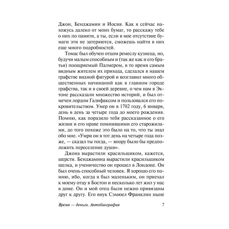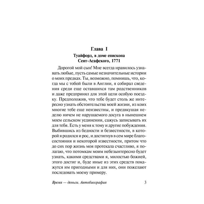 Время деньги одна из самых известных автобиографий в мире и одна из самых знаменитых историй возвышения человека, который всего добился сам. Бенджамин Франклин работал над своими мемуарами на протяжении последних двадцати лет своей жизни, с 1771 по 1790 годы, но успел довести повествование только до 1758 года. Впервые автобиография была опубликована уже после смерти Франклина и первые сто лет с момента первой публикации в печати существовало несколько разных версий, и только в 1868 году было опубликовано издание, максимально приближенное к оригинальному рукописному тексту.