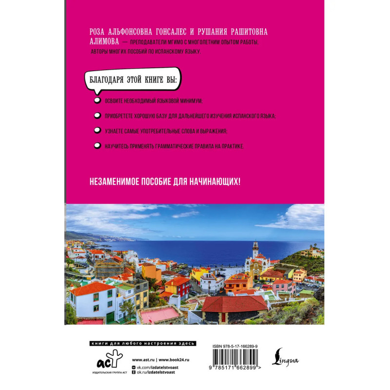 Роза Альфонсовна Гонсалес и Рушания Рашитовна Алимова — преподаватели МГИМО с многолетним опытом работы, авторы многих пособий по испанскому языку. Самоучитель поможет в краткий срок овладеть лексическим и грамматическим минимумом начального уровня и простыми формами разговорной речи. Материал курса разбит на 10 уроков, в которых представлены основные темы грамматики и полезная лексика, необходимая в повседневном общении. Для отработки практических навыков предлагается большое количество упражнений с ответами. Все тексты и диалоги даются с параллельным переводом на русский язык, в конце книги также помещен испанско-русский словарь. Книга адресована всем, кто хочет в краткие сроки овладеть основами испанского языка.