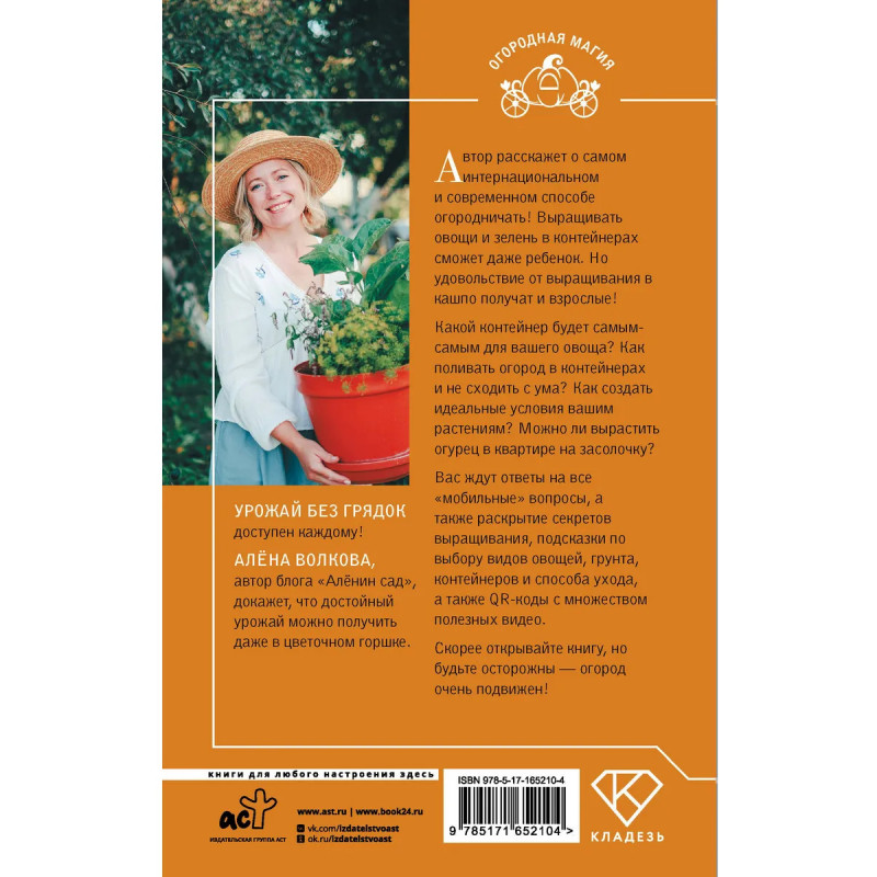 Урожай без грядок доступен каждому! Алёна Волкова, автор блога "Алёнин сад", докажет, что достойный урожай можно получить даже в цветочном горшке. Автор расскажет о самом интернациональном и современном способе огородничать! Выращивать овощи и зелень в контейнерах сможет даже ребенок. Но удовольствие от выращивания в кашпо получат и взрослые! Какой контейнер будет самым-самым для вашего овоща? Как поливать огород в контейнерах и не сходить с ума? Как создать идеальные условия вашим растениям? Можно ли вырастить огурец в квартире на засолочку? Вас ждут ответы на все "мобильные" вопросы, а также раскрытие секретов выращивания, подсказки по выбору видов овощей, грунта, контейнеров и способа ухода, а также QR-коды с множеством полезных видео. Скорее открывайте книгу, но будьте осторожны — огород очень подвижен!
