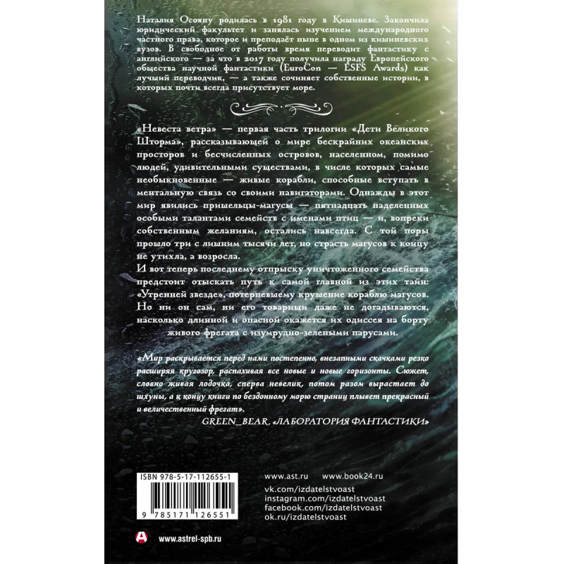 "Невеста ветра" первая часть трилогии "Дети Великого Шторма", рассказывающей о мире бескрайних океанских просторов и бесчисленных островов, населенном, помимо людей, удивительными существами, в числе которых самые необыкновенные живые корабли, способные вступать в ментальную связь со своими навигаторами. Однажды в этот мир явились пришельцы-магусы пятнадцать наделенных особыми талантами семейств с именами птиц и, вопреки собственным желаниям, остались навсегда. С той поры прошло три с лишним тысячи лет, но страсть магусов к интригам не утихла, а любовь к древним тайнам возросла. И вот теперь последнему отпрыску уничтоженного семейства предстоит отыскать путь к самой главной из этих тайн: "Утренней звезде", потерпевшему крушение кораблю магусов. Но ни он сам, ни его товарищи даже не догадываются, насколько длинной и опасной окажется их одиссея на борту живого фрегата с изумрудно-зелеными парусами.