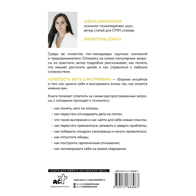 Автор книги Алена Смокотина — психолог-психотерапевт, EMDR-терапевт, коуч, блогер smokotina_coach и автор курсов по психологии. Опираясь на случаи из своей практики, она подробно рассказывает, как найти смелость быть собой. Эта книга — путеводитель по саморазвитию. О том, как ценить себя и выстраивать жизнь так, как хочется именно вам.