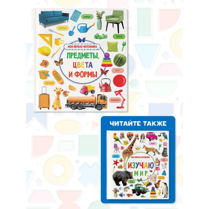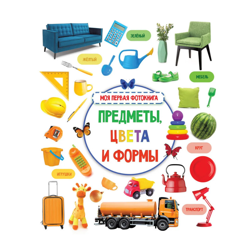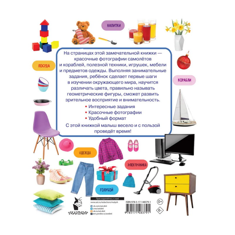О чём эта книга Предметы, цвета и формы это книжка с увлекательными заданиями для малышей. Рассматривая фотоизображения предметов домашнего обихода, игрушек и животных, дети будут изучать цвета и формы, знакомиться с окружающим миром.