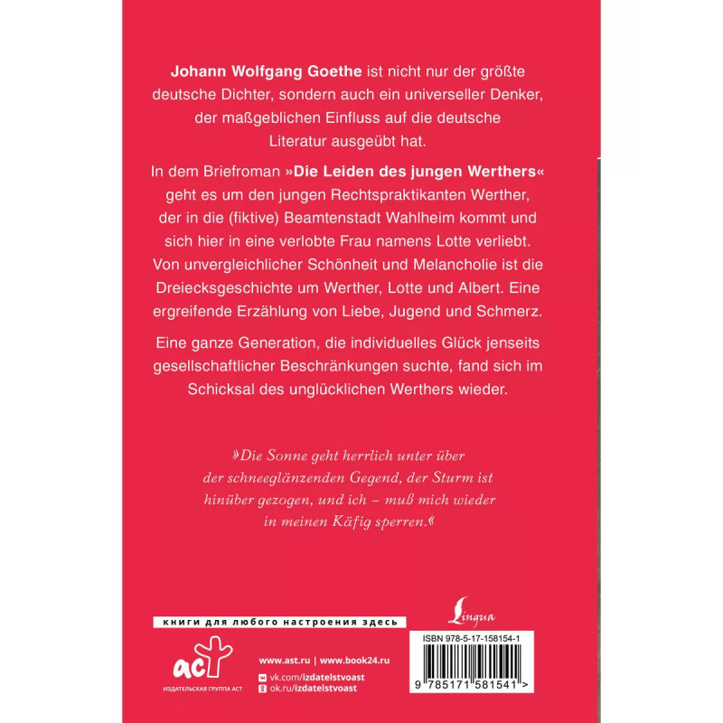 Die Leiden des jungen Werthers. Издание на немецком языке. Иоганн Вольфганг фон Гете - не только величайший немецкий поэт, но и мыслитель, оказавший значительное влияние на литературную и философскую мысль Запада. В эпистолярном романе "Страдания юного Вертера" рассказывается о юноше, который переезжает в небольшой городок, где влюбляется в девушку по имени Лотте, уже помолвленную с другим. История любовного треугольника Вертера, Лотте и ее жениха Альберта отличается несравненной красотой и утонченной меланхолией. Душевные переживания из-за запретной любви и равнодушие светского общества приводят к трагической гибели несчастного юноши. Его литературная судьба отразилась на реальной жизни целого поколения, одержимого мыслью о духовной близости с юным Вертером. Книга издана в неадаптированной версии. Насладитесь захватывающим повествованием о любви и страданиях героя романа Гете в оригинале!