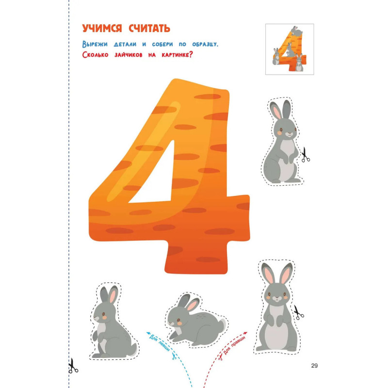 Ребёнку пора познакомиться с цифрами и освоить первый счёт? Лучший способ обучения — игровой и наглядный. Книга «Вырезай и клей. Цифры» — это 32 плотных листа-шаблона на спирали для создания цифр-вырезалок и цифр-аппликаций. Каждой цифре соответствует картинка забавного животного или птицы: двойка превращается в лебедя, тройка в змейку и т.д. Иллюстрации выполнены замечательной детской художницей Ириной Горбуновой. Каждая картинка состоит из крупных деталей, которые удобно вырезать и клеить как правшам, так и левшам. Вырезалки отлично тренируют мелкую моторику. Создание аппликаций развивает пространственное мышление и художественный вкус. Картинки-ассоциации помогают быстро запомнить все цифры. В нашей книге уже всё готово к эффективному обучению и самостоятельному творчеству. Жужа и Капа рекомендуют!