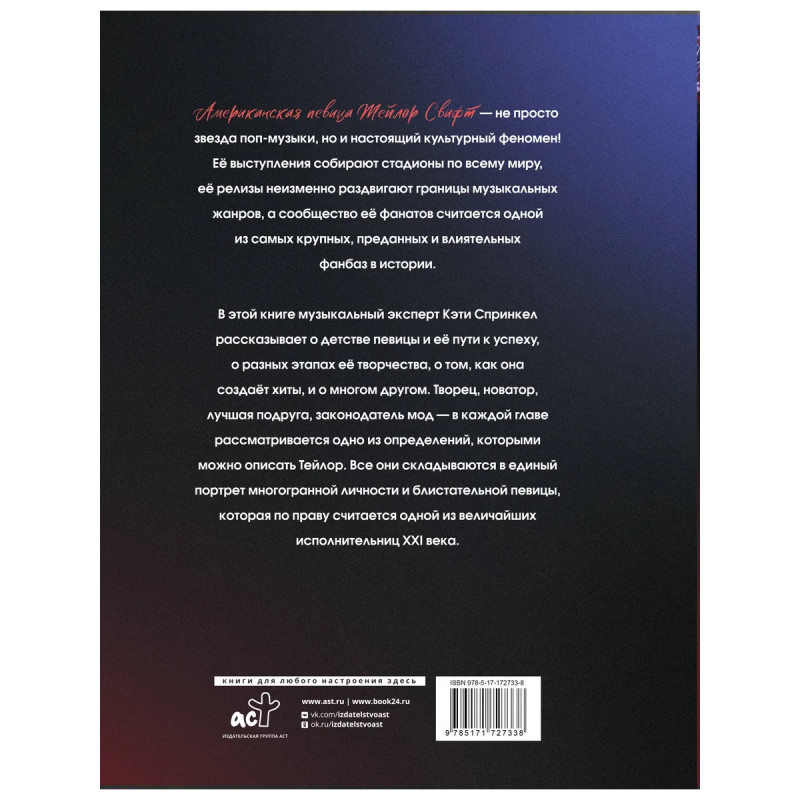 От первой песни, написанной в 12 лет, до статуса музыкальной иконы, объединившей 11 миллионов фанатов по всему миру в рамках последнего тура. Как Тейлор Свифт это удалось? Раскройте феномен Тейлор Свифт с книгой, которая описывает биографию звезды, раскрывает неочевидные грани ее личности, анализирует тексты культовых песен и позволяет с головой погрузиться в ее историю, полную побед и поражений, вдохновляющую не сдаваться на пути к мечте! Книга станет отличным дополнением к коллекции настоящих свифтис. А те, кто еще не знаком с ее творчеством, смогут узнать, почему вселенная Тейлор Свифт уникальна, изучается в университетах и имеет одну из крупнейших фанбаз в истории музыки. Подарочное издание в эксклюзивной обложке с арт-портретом Тейлор Свифт, созданным фанатом исполнительницы.