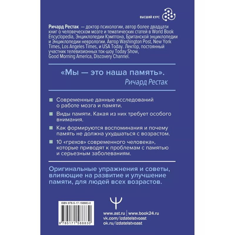 Поразительная память. Тайны, секреты, факты. Руководство для улучшения работы мозга. Мы давно перестали запоминать номера телефонов, даты рождения и даже важную информацию по работе. Ведь у нас под рукой есть смартфон и компьютер, которые "помнят все". Современный человек очень редко напрягает память, и в результате она перестает работать, а вместе с памятью страдают и остальные когнитивные функции мозга. Автор этой книги - Ричард Рестак - известный нейропсихолог, автор более двадцати книг о человеческом мозге. Эту книгу он написал, когда ему было почти 8 лет, и ему можно доверять, когда речь заходит о развитии памяти, сохранении ясного ума и активности до преклонного возраста. Ричард Рестак знает, что ухудшение памяти никак не связано с возрастом, а является следствием десяти "грехов" современного человека. Но упражнения, правильный сон и диета могут вернуть память, сделать ее великолепной в любом возрасте. Это одна из самых полных книг о памяти. Вы узнаете, как работает память и формируются воспоминания, как связаны разум, тело и эмоции, как управлять памятью и какие техники помогают сохран