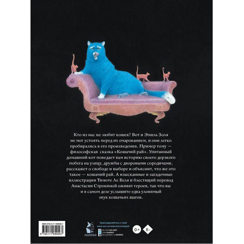 Кто из нас не любит кошек? Вот и Эмиль Золя не мог устоять перед их очарованием, и они легко пробирались в его произведения. Пример тому — философская сказка "Кошачий рай". Упитанный домашний кот поведает вам историю своего дерзкого побега на улицу, дружбы с дворовыми сородичами, расскажет о свободе и выборе и объяснит, что же это такое — кошачий рай. А изысканные и загадочные иллюстрации Тимоте Ле Веля и блестящий перевод Анастасии Строкиной оживят героев, так что вы и в самом деле услышите едва уловимый звук кошачьих шагов