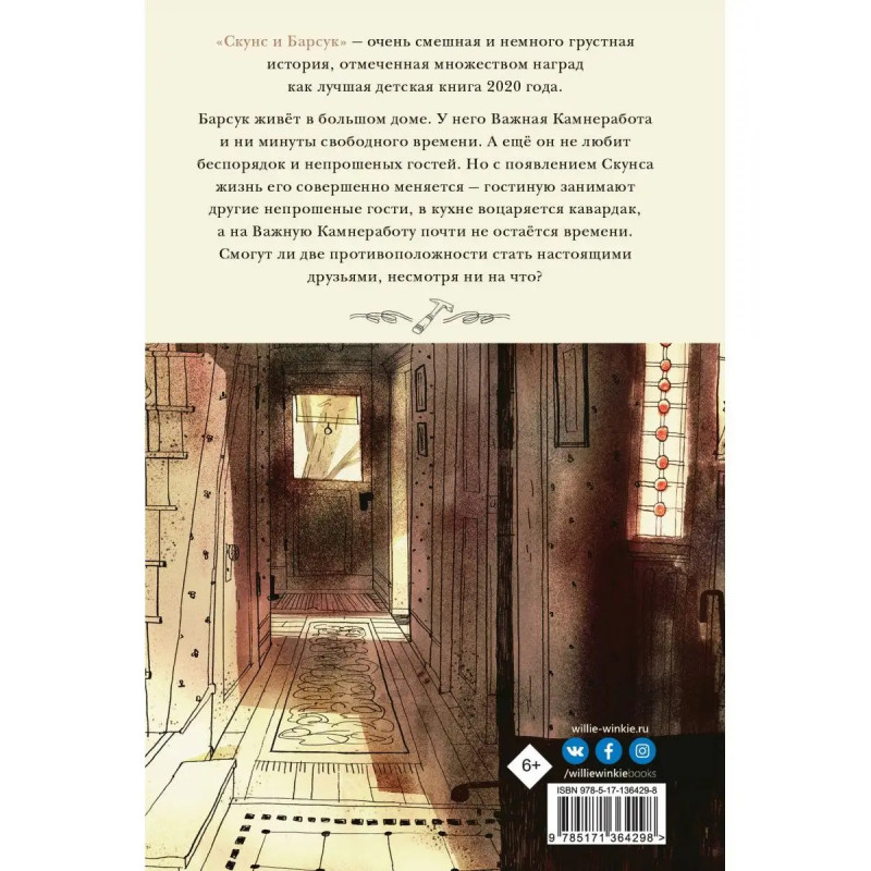Могут ли две противоположности стать настоящими друзьями? Барсук живёт в большом доме из красного кирпича. У него Важная Камнеработа и ни минуты свободного времени. А ещё он не любит беспорядок и непрошенных гостей. Но в какой-то момент его жизнь совершенно меняется. Ведь в дверь его дома из красного кирпича постучал Скунс. Вместе с ним начали появляться и другие непрошеные гости, в кухне воцарился кавардак, а на Важную Камнеработу почти не осталось времени. "Скунс и Барсук" - очень смешная и немного грустная история от Эми Тимберлейк с великолепными иллюстрациями Джона Классена, получившая множество наград как лучшая детская книга 22 года.