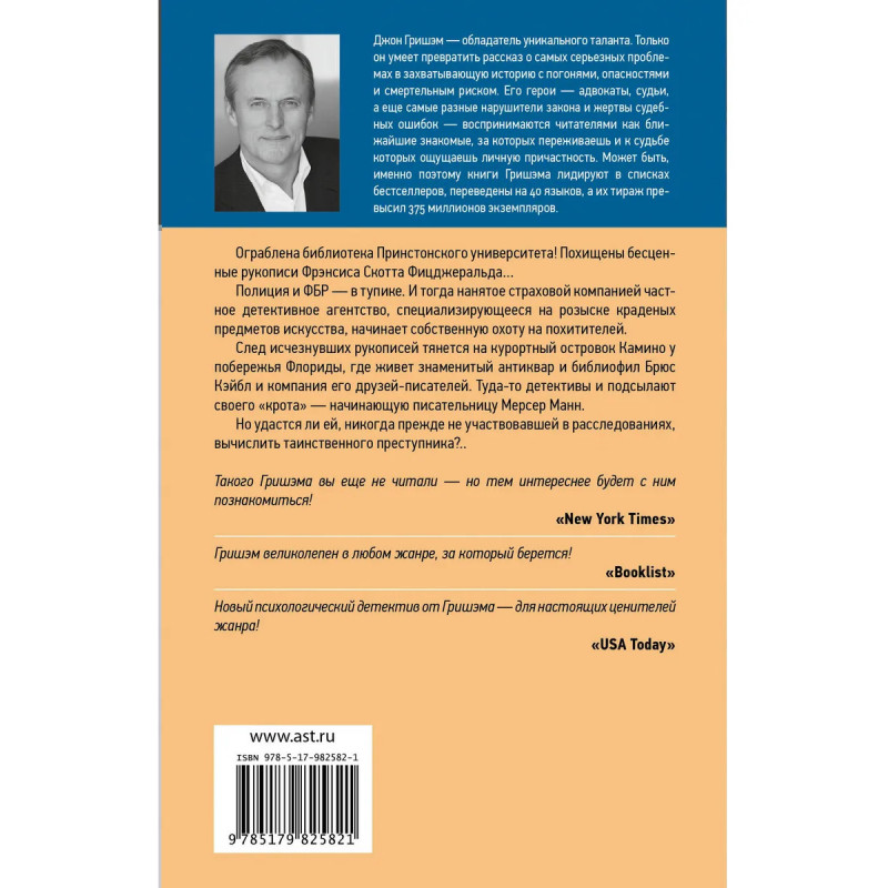 Ограблена библиотека Принстонского университета! Похищены бесценные рукописи Фрэнсиса Скотта Фицджеральда… Полиция и ФБР — в тупике. И тогда нанятое страховой компанией частное детективное агентство, специализирующееся на розыске краденых предметов искусства, начинает собственную охоту на похитителей. След исчезнувших рукописей тянется на курортный островок Камино у побережья Флориды, где живет знаменитый антиквар и библиофил Брюс Кэйбл и компания его друзей-писателей. Туда-то детективы и подсылают своего "крота" — начинающую писательницу Мерсер Манн. Но удастся ли ей, никогда прежде не участвовавшей в расследованиях, вычислить таинственного преступника?