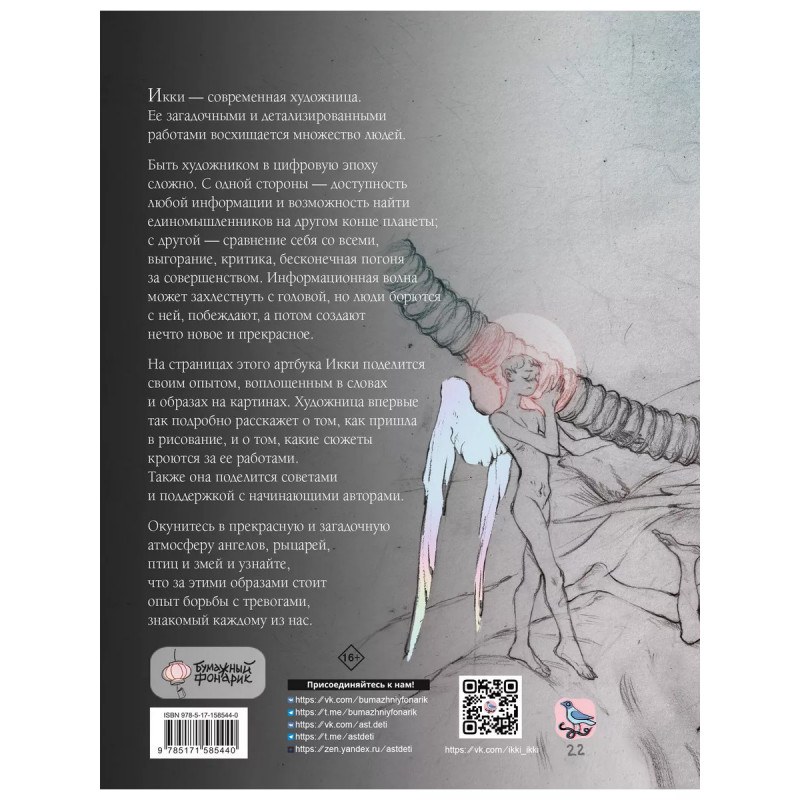 Артбук Икки. В данном артбуке собраны работы популярной современной художницы Икки, которая расскажет о своем творческом пути, сюжетах работ и опыте становления профессиональным художником. На страницах книги читателей встретят как самые популярные, так и новые работы. Детализированные и прекрасные иллюстрации не оставят никого равнодушным, а полезные советы касательно критики, выгорания, оттачивания мастерства и много другого будут особенно интересны для начинающих художников. Для широкого круга читателей.