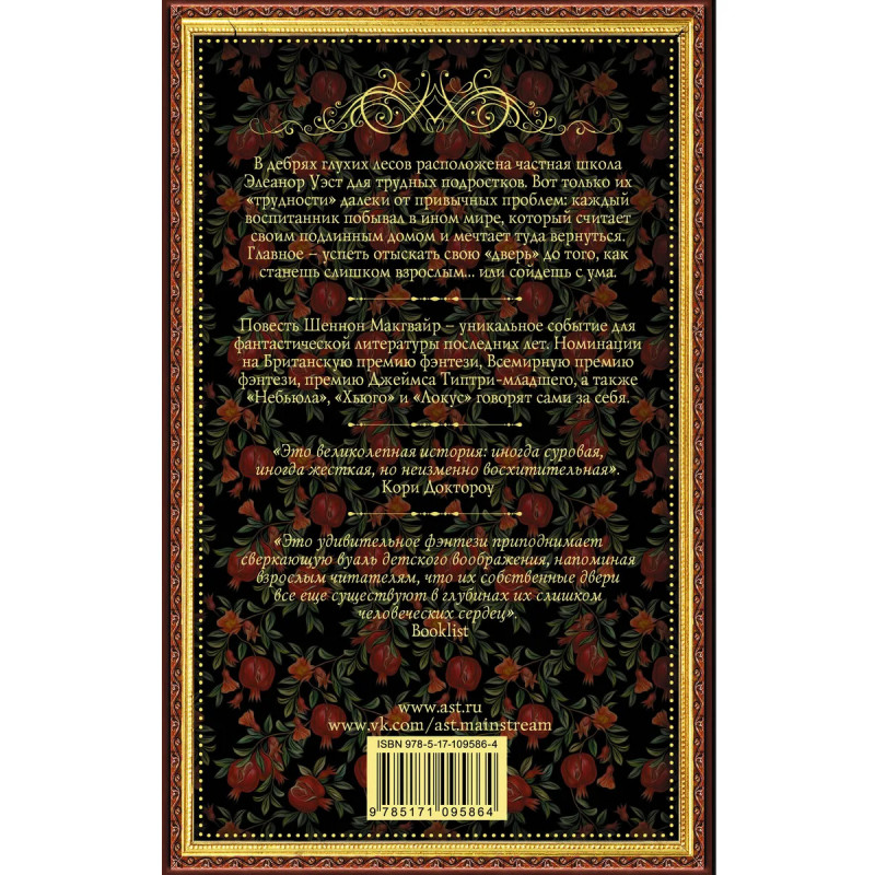 В дебрях глухих лесов расположена частная школа Элеанор Уэст для трудных подростков. Вот только их "трудности" далеки от привычных проблем: каждый воспитанник побывал в ином мире, который считает своим подлинным домом и мечтает туда вернуться. Главное — успеть отыскать свою "дверь" до того, как станешь слишком взрослым… или сойдешь с ума.
