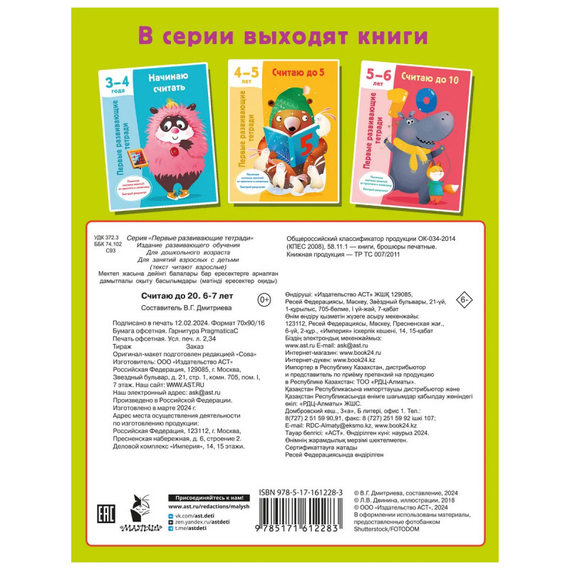 В серии «Первые развивающие тетради» — книги для любознательных малышей и заботливых родителей. Рабочая тетрадь «Считаю до 20. 6–7 лет» представляет интерес для будущих первоклассников, а также их родителей, — игровые задания развивают интеллект, формируют математические представления и ориентацию в пространстве, закрепляют правила выполнения простых арифметических действий. Приобретая это пособие для своего ребёнка, вы поможете ему: • подготовить руку к письму, научиться держать ручку и карандаш; • запомнить правильное начертание цифр; • выучить порядковый и количественный счёт в пределах 20; • потренироваться в сложении и вычитании; • развить мышление, логику, внимание, память; • стать более усидчивым и аккуратным.