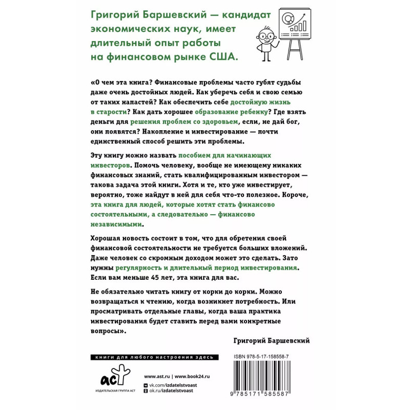 Хочешь выжить? Инвестируй! 65 шагов от нуля до профи. Григорий Баршевский - кандидат экономических наук, имеет длительный опыт работы на финансовом рынке США. "О чем эта книга? Финансовые проблемы часто губят судьбы даже очень достойных людей. Как уберечь себя и свою семью от таких напастей? Как обеспечить себе достойную жизнь в старости? Как дать хорошее образование ребенку? Где взять деньги для решения проблем со здоровьем, если, не дай бог, они появятся? Накопление и инвестирование - почти единственный способ решить эти проблемы. Эту книгу можно назвать пособием для начинающих инвесторов. Помочь человеку, вообще не имеющему никаких финансовых знаний, стать квалифицированным инвестором - такова задача этой книги. Хотя и те, кто уже инвестирует, вероятно, тоже найдут в ней для себя что-то полезное. Короче, эта книга для людей, которые хотят стать финансово состоятельными, а следовательно - финансово независимыми. Хорошая новость состоит в том, что для обретения своей финансовой состоятельности не требуется больших вложений. Даже человек со скромным доходом може