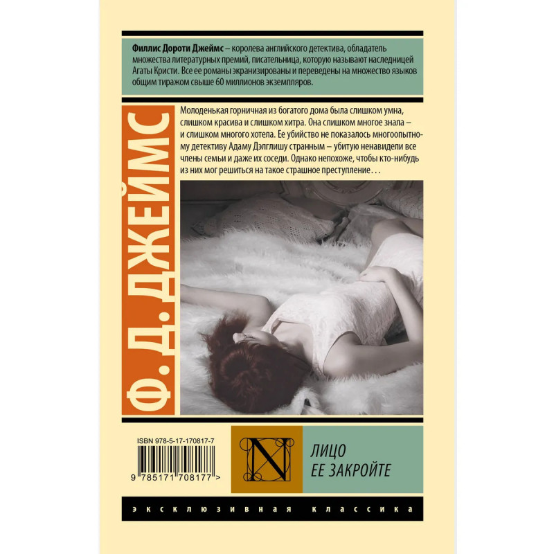 — Романы Филлис Дороти Джеймс — классика британского детектива. Они переведены на множество иностранных языков и разошлись по миру тиражом свыше 60 000 000 экземпляров. Романы писательницы идеально подходят для всех ценителей творчества Агаты Кристи, Дороти Ли Сэйерс, Джозефины Тэй и Найо Марш. — «Лицо ее закройте» — дебютный роман писательницы и первая книга из цикла о расследованиях детектива-инспектора Адама Дэлглиша. Адам Дэлглиш — один из самых популярных персонажей детективного жанра, книги о нем неоднократно экранизировали и адаптировались для радио, и «Лицо ее закройте» не стало исключением. — Издание в серии «Эксклюзивная классика» — в удобном формате и узнаваемом оформлении.
