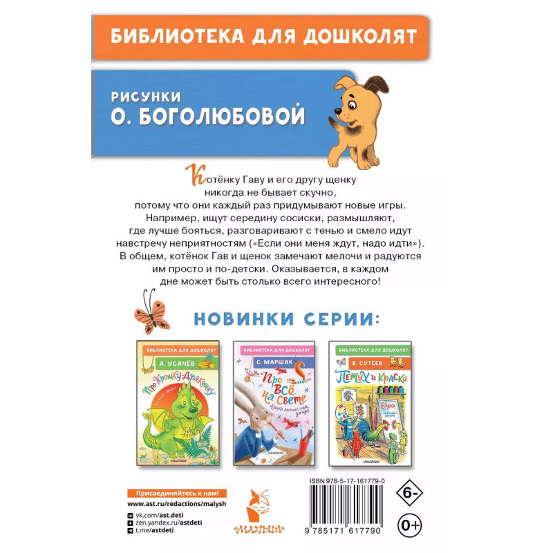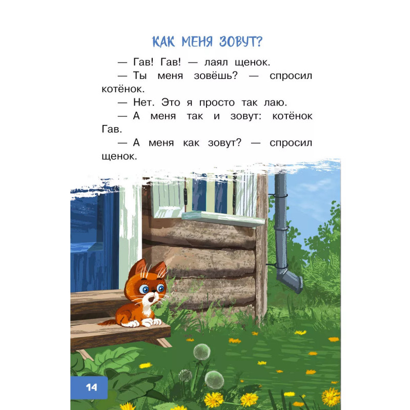 Котёнок по имени Гав. Котёнку Гаву и его другу щенку никогда не бывает скучно, потому что они каждый раз придумывают новые игры. Например, ищут середину сосиски, размышляют, где лучше бояться, разговаривают с тенью и смело идут навстречу неприятностям ("Если они меня ждут, надо идти"). В общем, котёнок Гав и щенок замечают мелочи и радуются им просто и по-детски. Оказывается, в каждом дне может быть столько всего интересного!