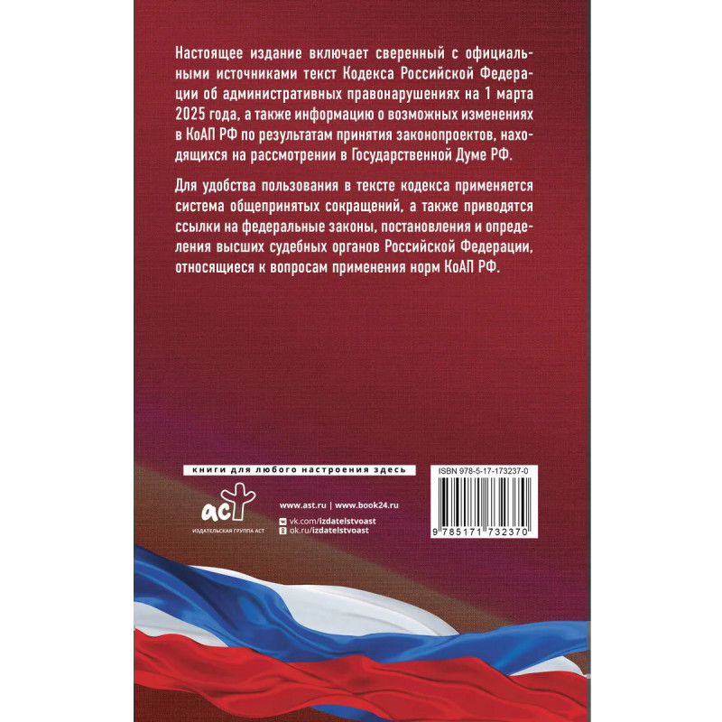 Данное издание кодекса Российской Федерации об административных правонарушениях сверено с официальным источником и приводится по состоянию на 1 марта 2025 года. Кодекс учитывает все изменения, опубликованные в официальных источниках на момент подписания издания в печать. В издании представлена информация о возможных изменениях в КоАП РФ по результатам принятия законопроектов, находящихся на рассмотрении в Государственной Думе РФ. Для удобства пользования в тексте кодекса применяется система общепринятых сокращений, а также приводятся ссылки на федеральные законы, постановления Правительства Российской Федерации, постановления и определения высших судебных органов Российской Федерации, относящиеся к вопросам применения норм КоАП РФ.