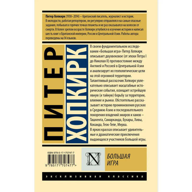 — Классика исторической мысли. — Питер Хопкирк — британский журналист, писатель и историк, специализирующийся на истории Британской империи и Центральной Азии. — «Большая игра» — фундаментальное исследование противостояния между Англией и Россией в Центральной Азии, увлекательный рассказ о двух веках шпионажа, авантюр и приключений. — Издание в серии «Эксклюзивная классика» — в удобном формате и узнаваемом оформлении.