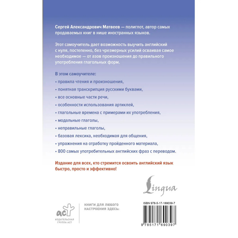 Этот самоучитель дает возможность выучить английский с нуля, постепенно, без чрезмерных усилий осваивая самое необходимое. Здесь вы найдете основы английского произношения и правила чтения. Большинство английских слов и предложений сопровождаются транскрипцией русскими буквами. Подробно представлены все основные части речи и их особенности. Вся грамматика изложена просто, наглядно и с большим количеством примеров. К английским фразам и выражениям дан перевод на русский язык. Упражнения помогут легко закрепить новые знания. По мере прохождения материала даются тематические словарики, позволяющие постепенно увеличивать свой словарный запас и использовать эту лексику в разговоре. В конце книги помещена таблица неправильных глаголов, а также англо-русский разговорник.Проработав этот самоучитель, читатель освоит язык на уровне А2, научится понимать английскую речь на слух, читать несложные тексты, а также общаться на бытовые темы.
