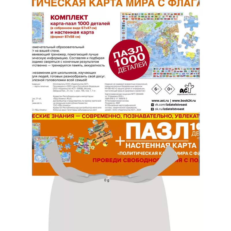 Комплект: Пазл 1000 деталей (в собранном виде 67х47 см) + настенная карта формата 87х58 см: помощь для запоминания стран, их столиц и флагов; полезная и увлекательная игра для всей семьи; удобная упаковка. Настенная карта декоративный образовательный объект на вашей стене. ПАЗЛ полезный и увлекательный досуг плюс обучение. Собирая пазл, лучше усваивается картографическая информация. Составляя и подбирая кусочки карты, необходимо сверяться с конечным результатом изображения, соответственно тренируется память, аккуратность и внимательность. Данный пазл будет незаменим для школьников, изучающих географию, а также для людей, готовых разнообразить свой досуг. Займитесь сбором полезной головоломки всей семьей! Упаковка в ПВХ-пакет с европодвесом и объемным дном детали пазла не потеряются при транспортировке. ГЕОГРАФИЧЕСКИЕ ЗНАНИЯ СОВРЕМЕННО, ПОЗНАВАТЕЛЬНО, УВЛЕКАТЕЛЬНО!