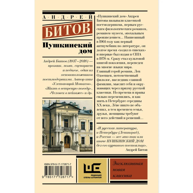 - Переиздание книги культового постмодерниста в серии «Эксклюзивная новая классика». Удобный покет. - Филологический роман-музей, наследующий великой русской литературе. Роман-наказание — со слов самого Андрея Битова. - Главный герой истории — ленинградский филолог Лев Одоевцев, пытающийся наладить отношения с близкими — в особенности с дедом Модестом Платоновичем. Это не столько конфликт отцов и детей, сколько конфликт двух ученых с разным подходом к русской литературе, спор двух ментальностей. А еще — история о максимальной несхожести судеб книжных героев с любыми реальными судьбами. - Захватывающая интертекстуальная история разворачивается сразу на нескольких уровнях и предлагает читателю ключи для рефлексии на тему аллюзий на литературу XIX–XX веков.
