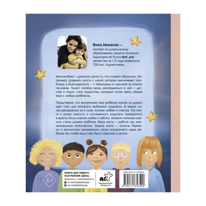 Вика Минасян — эксперт по дошкольному образованию, педагог-психолог. Аудитория её блога deti_psy менее чем за 1,5 года превысила 700 тыс. подписчиков. Миссия Вики — доносить легко то, что сложно объяснить. Например, сравнить злость с лупой, которая увеличивает проблему, а благодарность — с пёрышком от крыльев за спиной человека. Талант учителя начал раскрываться в ней с детства и помог стать педагогом, который готов найти общий язык с любым ребенком. Представьте, что внутренний мир ребёнка похож на домик, цвет стен для которого выбирают родители. В ваших силах разукрасить их в тона, полные любви и счастья. Эта книга в руках умелого и осознанного родителя превратится в краску безусловной любви и заботы. Можете начинать красить стены домика ребёнка. Ваша кисть — работа над эмоциональным интеллектом. Задача книги — помочь бережно и экологично разукрасить стены внутреннего мира ребёнка так, чтобы ему в нем было сказочно и уютно.