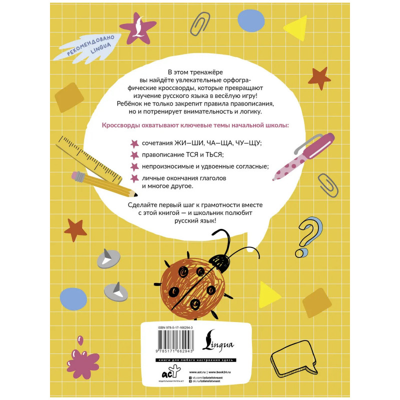 Эта книга предлагает увлекательный и необычный способ отработки орфографических правил, которые дети зачастую знают, но не всегда могут применить на практике. Здесь вы найдёте весёлые кроссворды по темам, которые проходят на уроках русского языка в начальных классах: гласные после шипящих, непроизносимые и удвоенные согласные, безударные гласные, правописание Ъ и Ь, глагольные окончания и другие орфограммы. Выполняя оригинальные задания, ребёнок учится внимательно относиться к написанию слов, развивает логику и с лёгкостью замечает ошибки. Пособие можно использовать на уроках русского языка или во внеурочной деятельности, а также для самостоятельных занятий дома с детьми, учащимися в 1-4 классах.