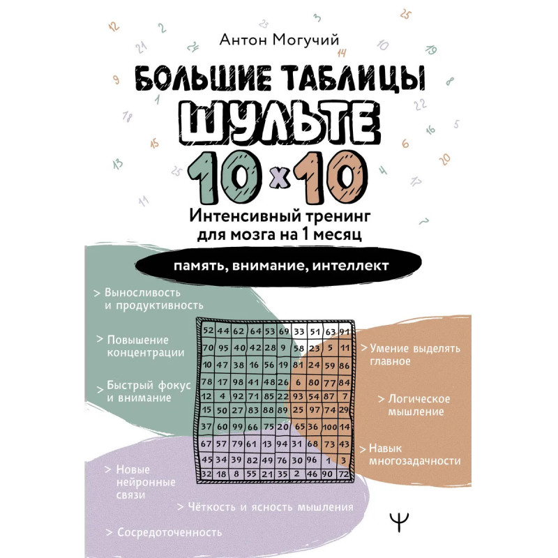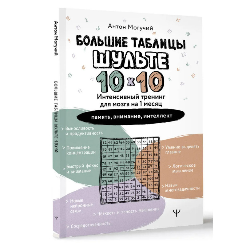Развивайте интеллект, внимание и память еще быстрее с инновационной системой тренировок Антона Могучего, направленной на улучшение работы мозга, внимания и памяти! Увеличенный размер "таблиц Шульте" 10 х 10 открывает новые возможности для интеллектуального роста на продвинутом уровне и делает тренировки в два раза более эффективными. Ощутите, как ваш мозг работает на максимум уже после первых занятий! С помощью этого тренажера вы сможете повысить работоспособность, укрепить память и даже развить логическое мышление! Вы также научитесь работать в режиме многозадачности, быстро переключаться между делами, оперативно принимать решения и управлять своим вниманием. Прокачайте ваш мозг на максимум! Этот тренажер поможет вам: · стать сосредоточенным и внимательным; · повысить скорость мышления; · улучшить память; · оставаться выносливым и продуктивным на протяжении длительного времени. Книга-рабочая тетрадь в мягкой обложке.