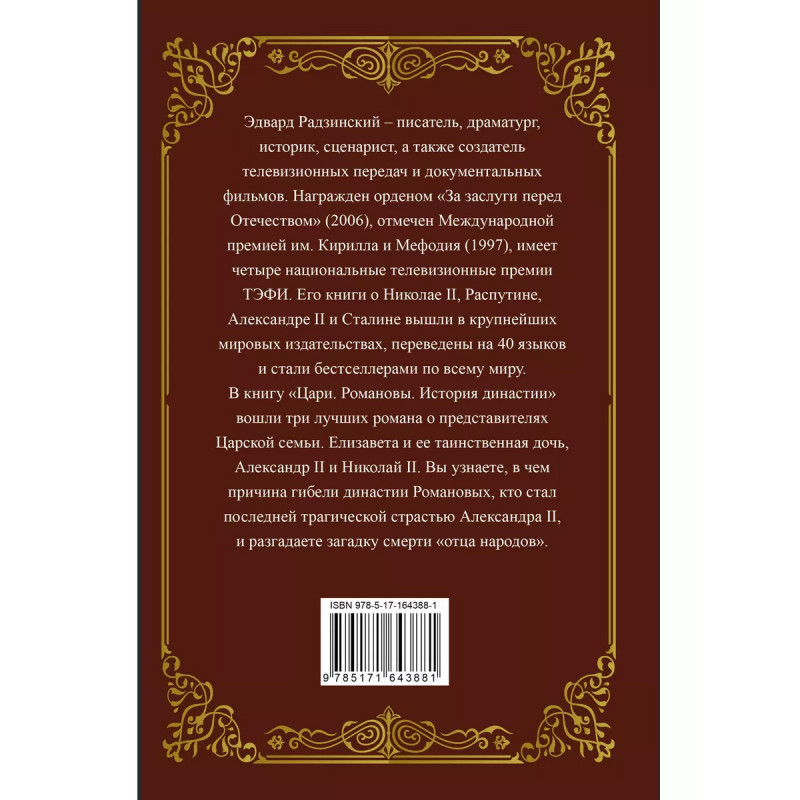 Эдвард Радзинский писатель, драматург, историк, сценарист, а также создатель телевизионных передач и документальных фильмов. Награжден орденом "За заслуги перед Отечеством" (2006), отмечен Международной премией им. Кирилла и Мефодия (1997) и четырех национальных телевизионных премий ТЭФИ. Его книги о Николае II, Распутине, Александре II и Сталине вышли в крупнейших мировых издательствах, переведены на 40 языков и стали бестселлерами по всему миру. В книгу "Цари. Романовы. История династии" вошли три лучших романа о представителях Царской семьи. Елизавета и ее таинственная дочь, Александр II и Николай II. Вы узнаете в чем причина гибели династии Романовых, кто стал последней гибельной страстью Александра II и загадку смерти "отца народов".