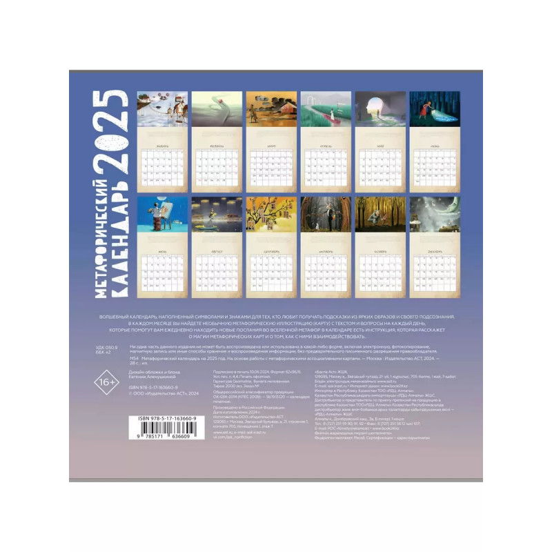 Волшебный календарь, наполненный символами и знаками для тех, кто любит получать подсказки из ярких образов и своего подсознания. В каждом месяце вы найдете необычную метафорическую иллюстрацию (карту) с текстом и вопросы на каждый день, которые помогут вам ежедневно находить новые послания во вселенной метафор. В календаре есть инструкция, которая расскажет о магии метафорических карт и о том, как с ними взаимодействовать.