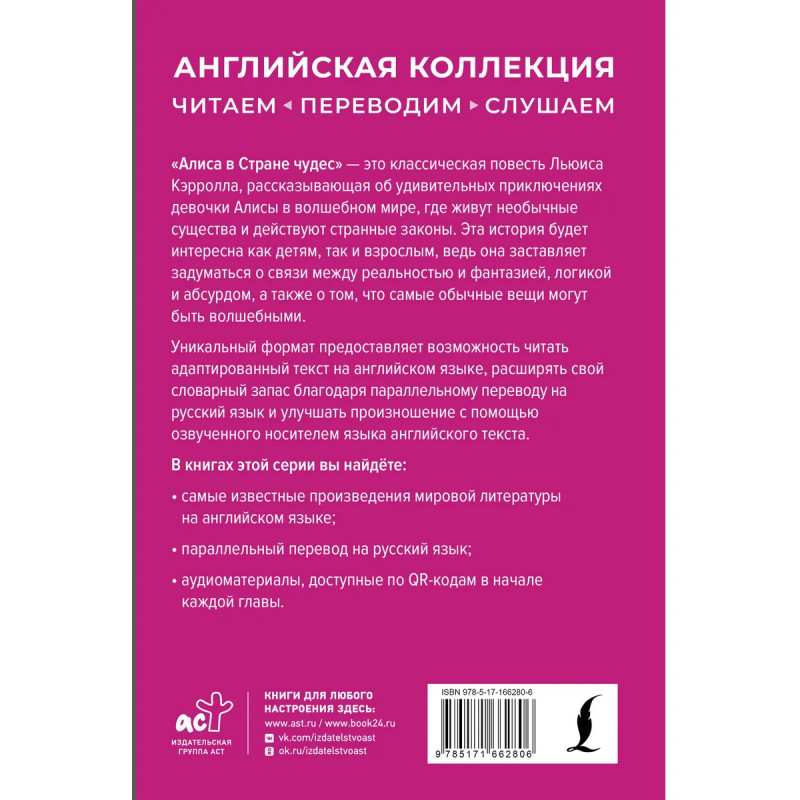 Зачем белому кролику карманные часы? Почему улыбается Чеширский кот? Чем ворон похож на конторку? Как играть в королевский крокет? Отправляйтесь вместе с Алисой вниз по кроличьей норе в Страну чудес, где вас ждут увлекательные приключения, неожиданные встречи с необычными существами, безумное чаепитие и даже суд! Адаптированный английский текст и перевод на страницах одной книги помогут легко познакомиться с лучшими произведениями мировой литературы и выучить английский язык с удовольствием. Благодаря параллельным текстам вы быстро расширите свой словарный запас, а также усвоите употребительные грамматические конструкции и устойчивые выражения. Английский текст полностью озвучен носителем языка и бесплатно доступен для прослушивания по QR-коду, расположенному в начале каждой главы. Издание адресовано всем, кто хочет совершенствовать свои знания и читать литературу на языке оригинала.