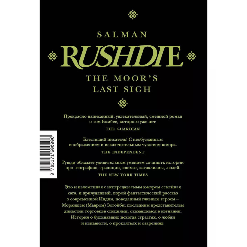 Прощальный вздох мавра. Салман Рушди - всемирно известный британский писатель индийского происхождения, автор 16 книг, переведенных более, чем на 4 зыков. Его роман "Дети полуночи" получил Букеровскую премию, "Букера Букеров", а в 28 году был назван лучшей книгой за 4 лет существования премии. "Прощальный вздох мавра" - пятый по счету роман писателя, удостоенный Уитбредовской премии (1995) и премии Aristeion (1996), а также вошедший в шот-лист Man Booker Prize. Его главный герой Мораиш Зогойби, по прозвищу Мавр, рассказывает историю своей семьи - четырех поколений династии торговцев специи, ведущих свой род от португальского путешественника Васко да Гамы. Но да Гама - не единственный великий предок. Среди своих предшественников Мавр называет Боабдиля, последнего эмира Гранады - того самого, в честь которого назван знаменитый гранадский перевал "Прощальный вздох мавра". Именно отсюда бросил он свой прощальный взгляд на захваченную неприятелем Альгамбру. Символично, что в самом начале романа мы видим Мавра в андалузском (правда, вымыш