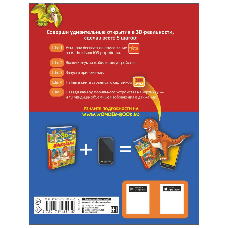 Это не просто книга о динозаврах, а настоящая интерактивная 3D-энциклопедия! Ее можно читать, изучать по движущимся объемным картинкам и даже лично пообщаться с героями -- ископаемыми ящерами. Выполни несложные инструкции, и ты поздороваешься со спинозавром, померишься ростом с зауроподом, удивишься полету птеродактиля и понаблюдаешь, как охотится дифолозавр. А кроме этих и множества других открытий, читателя ожидает настоящий сюрприз -- редкий шанс сделать селфи с самым грозным доисторическим животным. Как же его зовут? Прочти эту книгу, и ты узнаешь это! Для дошкольного возраста.