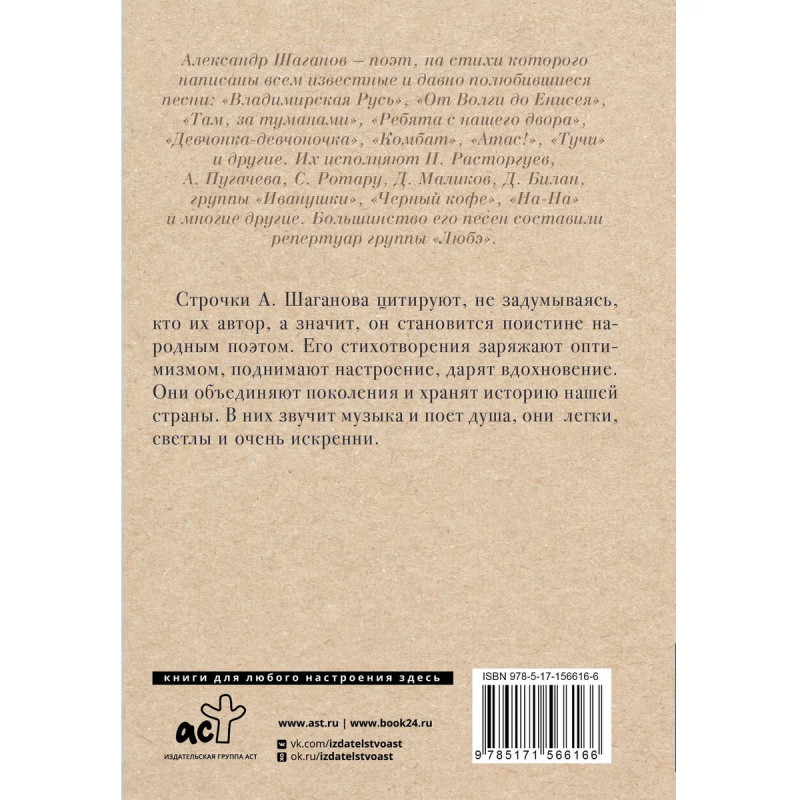 Александр Шаганов поэт, на стихи которого написаны всем известные и давно полюбившиеся песни: "Владимирская Русь", "От Волги до Енисея", "Там за туманами", "Ребята с нашего двора", "Девчонка-девчоночка", "Комбат", "Атас!", "Тучи" и другие. Их исполняют А. Пугачева, С. Ротару, Д. Маликов, Д. Билан, группы "Иванушки", "Черный кофе", "На-На" и многие другие. Большинство его песен составили репертуар группы "Любэ". Cтрочки А. Шаганова цитируют, не задумываясь, кто их автор, а значит, он становится поистине народным поэтом. Его стихотворения заряжают оптимизмом, поднимают настроение, дарят вдохновение. Они объединяют поколения и хранят историю нашей страны. В них звучит музыка и поет душа, они легки, светлы и очень искренни.