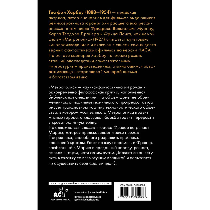 — Впервые на русском языке — классика мировой литературы. — «Метрополис» — это одновременно научно-фантастический роман и насыщенная библейскими аллюзиями философская притча. — Литературная основа знаменитого одноименного фильма немецкого режиссера Фрица Ланга. — В переводе Нины Николаевны Федоровой.