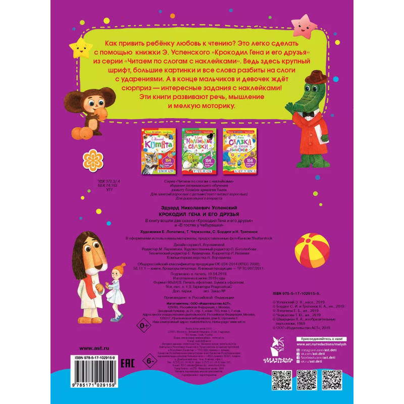 Крокодил Гена и его друзья. Перед вами замечательный сборник сказок с красочными наклейками. Это первые уроки самостоятельного чтения. Крупные буквы, слова разбитые на слоги, знаки ударения, помогут вашему ребенку перейти от слогового чтения к чтению целыми словами и предложениями. С яркими наклейками научиться читать можно легко и с удовольствием.