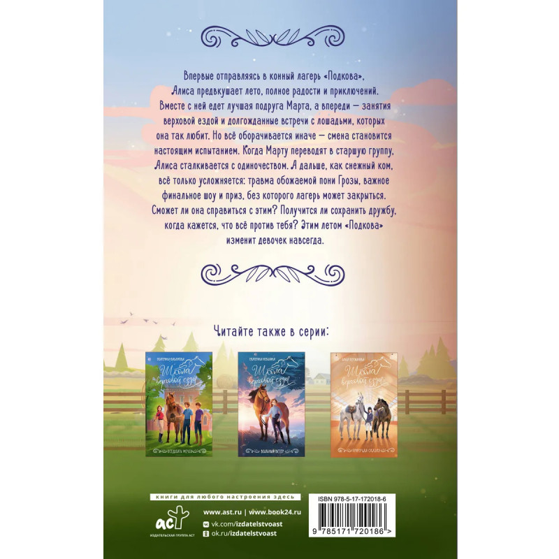 – Подростковый роман в сеттинге конно-спортивного лагеря. – История о дружбе, которая преодолеет любые невзгоды, об умении поступать по совести, признавать свои ошибки и прощать чужие. – Нести ответственность за животное, познать горечь разочарования, почувствовать себя одиноким, найти единомышленников и свое призвание – нормальная часть взросления, через которую придется пройти героям.