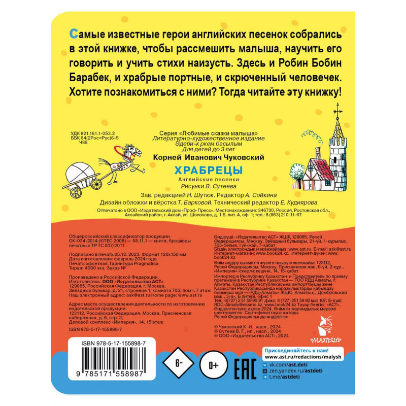 Cамые известные герои английских песенок собрались в этой книжке, чтобы рассмешить малыша, научить его говорить и учить стихи наизусть. Здесь и Робин Бобин Барабек, и храбрые портные, и скрюченный человечек. Хотите познакомиться с ними? Тогда читайте эту книжку! К. И. Чуковский и В. Г. Сутеев - классики отечественной детской литературы. Английские песенки, дополненные простыми, динамичными иллюстрациями, идеально подойдут для первого знакомства с книгой, помогут развить речь, память и кругозор. Эта книга предназначена именно для малышей: в ней яркие рисунки и крупные буквы, плотный картон не порвется при чтении, а скругленные уголки не повредят маленькие пальчики.