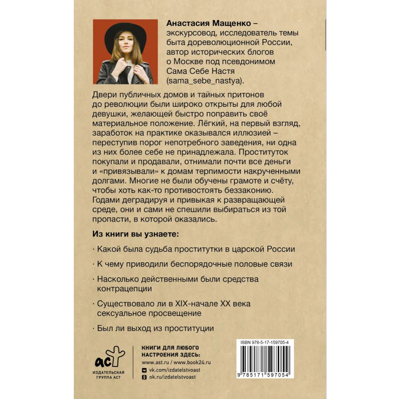 Мащенко Анастасия – экскурсовод, исследователь темы быта дореволюционной России, автор исторических блогов о Москве под псевдонимом Сама Себе Настя (sama_sebe_nastya). Двери публичных домов и тайных притонов до революции были широко открыты для любой девушки, желающей быстро поправить своё материальное положение. Лёгкий, на первый взгляд, заработок на практике оказывался иллюзией – переступив порог непотребного заведения, ни одна из них более себе не принадлежала. Проституток покупали и продавали, отнимали почти все деньги и "привязывали" к домам терпимости накрученными долгами. Многие не были обучены грамоте и счёту, чтобы хоть как-то противостоять беззаконию. Годами деградируя и привыкая к развращающей среде, они и сами не спешили выбираться из той пропасти, в которой оказались.
