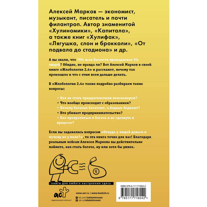 Алексей Марков — экономист, музыкант, писатель и почти филантроп. Автор знаменитой "Хулиномики", а также книг "Хулифак", "Лягушка, слон и брокколи" и др. Только представьте на секунду, что все богатства планеты будут принадлежать ничтожно малому количеству людей. Не представляйте. Оглянитесь. Так оно и есть – 70% всех богатств принадлежат 3% людей. Обидно, не правда ли? Вот Алексей Марков в своей книге "Жлобология 2.4" и расскажет, почему так произошло и что с этим всем дальше делать. "Жлобология 2.4" также подробно разберет следующие вопросы: • Как не стать тридцатилетним пенсионером? • Что вообще происходит с образованием? • Почему богатые богатеют, а бедные беднеют? • Кто убивает предпринимательство? • Как превратиться в богача и не сдохнуть в процессе? Если вы задавались вопросом: "Откуда у людей деньги и почему не у меня?", то эта книга точно для вас!