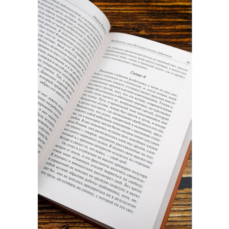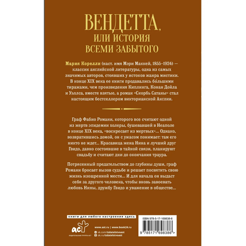 — Новинка в серии «Викторианский бестселлер». В ней будут выходить самые известные произведения, написанные во времена правления королевы Виктории. — Марию Корелли можно назвать одним из первых авторов бестселлеров в мире. Ее дебютный роман «Скорбь Сатаны» всего за два месяца после выхода разошелся тиражом свыше 50 000 экземпляров. «Вендетта», ее второй роман, проявила чудеса выдержки и долголетия — за первые двадцать лет книга выдержала 37 переизданий. — На страницах романа «Вендетта, или история Всеми забытого» разворачивается трагическая история предательства и мести.