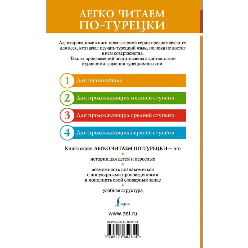 Ищете, что интересного почитать на турецком? Тогда смело берите эту книгу! София Леонидовна Куталмыш — кандидат филологических наук, специалист по турецкому языку, автор пособий по изучению турецкого языка. Она написала несколько простых рассказов на турецком языке о самых необычных и важных традициях Турции. Вы узнаете о соленом кофе, значении хны, чайной культуре и ключевых турецких праздниках. В конце каждого рассказа вы сможете выполнить несколько простых упражнений на понимание прочитанного и запоминание слов, а также проверить себя по ключам. Помимо этого, издание сопровождается турецко-русским словарем. Книга подходит для всех, кто начинает учить турецкий язык и нуждается в языковой практике.