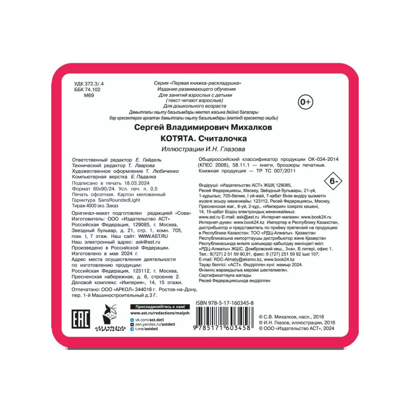 Завладеть вниманием ребёнка и превратить занятие в весёлую игру родителям поможет увлекательная серия Первая книжка-раскладушка. Стихи Сергея Михалкова золотой фонд детской литературы, чёткие по ритму, образные и легко запоминающиеся. Каждая книжка-малышка этой серии занимательная, полезная игра со страничками, которые раскладываются гармошкой. Формат книги удобен для маленьких детских ручек. Страницы имеют безопасные закруглённые края. Плотный картон с глянцевой плёнкой сохранит книгу на долгое время. Малышу очень интересно слушать любимые стихи и искать нужные картинки, кроха с удовольствием сможет досказать словечко, на пальчиках сосчитать до пяти. Пусть ваш малыш растёт, развивается и радует вас своими успехами!
