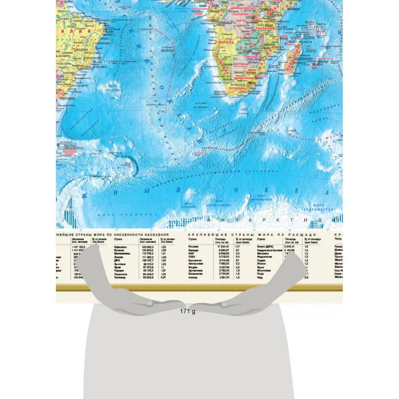 Карта формата А имеет размеры 117х79 мм. На одной стороне листа - Политическая карта мира масштаба 1:32 (в 1 см 32 км). На карте представлены все независимые государства мира, а также зависимые территории и территории с особым статусом. Пунсонами показаны населённые пункты с градациями "более 1 млн жителей", "от 1 тыс. до 1 млн жителей" и "менее 1 тыс. жителей". Основную карту дополняет врезка в более крупном масштабе на Европу. На другой стороне листа карта "Федеративное устройство России" в масштабе 1:7 . На карте представлены 89 субъектов Федерации, включая Республику Крым и Севастополь, Донецкую и Луганскую народные республики, Запорожскую и Херсонскую области, с их столицами и центрами. Субъекты РФ сгруппированы по 8 федеральным округам. Численность населения городов и посёлков дана по 6 градациям. Показаны магистральные пути железнодорожного и автомобильного сообщения.