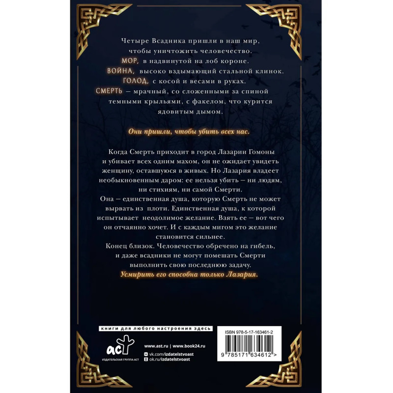 – Четвертая финальная часть фэнтезийного цикла «Всадники Апокалипсиса». – Мрачная, гнетущая атмосфера заката человечества. Ненасытный Смерть готов на все, чтобы забрать то, что считает своим. – Рейтинг 4,6 из 5 на Амазон. – Для фанатов темного фэнтези Пенелопы Дуглас, Дженнифер Арментроут, Кэрри Манискалко, Скарлетт Ст. Клэр и Шелби Махерин.