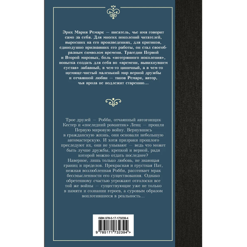 — От автора бестселлеров «Триумфальная арка» и «На западном фронте без перемен». — Роман о судьбах потерянного поколения — они вернулись живыми с войны, но призраки прошлого по-прежнему не отпускают их. — «Три товарища» — один из самых известных романов Ремарка. Роман неоднократно экранизировался и по-прежнему ставится на всех мировых театральных подмостках. — Эрих Мария Ремарк — один из самых известных писателей XX века. — Издание в серии «Лучшая мировая классика» — в лаконичном оформлении и твердой обложке.